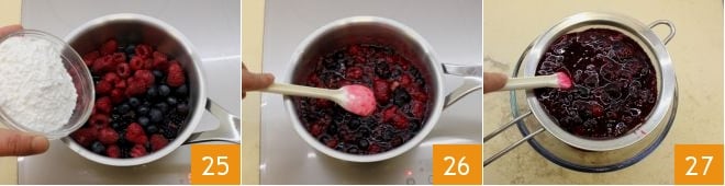 Fügen Sie den Puderzucker hinzu 25, rühren Sie, bis alles gut vermischt ist, dann lassen Sie es bei niedriger Hitze noch eine Minute kochen 26. Filtern Sie die erhaltene Mischung mit einem Sieb, um eventuelle Samen zu entfernen: Drücken Sie die Früchte gut mit der Rückseite eines Löffels und sammeln Sie die Sauce in einer kleinen Schüssel 27.