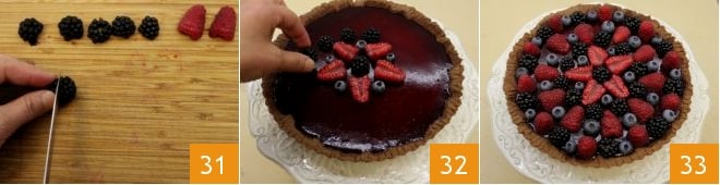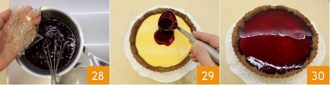 Übertragen Sie die Sauce in einen kleinen Topf und fügen Sie die aus dem Wasser entnommene und gut ausgedrückte Gelatine hinzu, lassen Sie sie bei niedriger Hitze unter Rühren des Gemisches 5 Minuten lang auflösen 28. Schalten Sie die Hitze aus und nehmen Sie die gefüllte Tarte aus dem Kühlschrank. Gießen Sie die heiße Coulis auf die Oberfläche, mit einem Löffel 29 und dosieren Sie sie so, dass sie nicht aus der Torte austritt 30. Stellen Sie das Dessert für mindestens weitere 2 Stunden in den Kühlschrank.