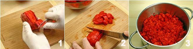 Um die Kaktusfeigenmarmelade zuzubereiten, beginnen Sie mit der Sterilisation der Gläser, gemäß den Richtlinien des Gesundheitsministeriums, die am Ende des Rezepts aufgeführt sind. Nachdem Sie diesen Schritt erledigt haben, kümmern Sie sich um die Kaktusfeigen: Ziehen Sie zuerst ein Paar Gummihandschuhe an. Der einfachste Weg, die dicke Schale zu entfernen, besteht darin, die beiden Enden abzuschneiden und mit einem scharfen Messer Einschnitte entlang der gesamten Länge der Kaktusfeige zu machen, dann die Schale mit Hilfe der Messerklinge zu Ihnen hin abzuziehen 1. Schneiden Sie das Fruchtfleisch der Kaktusfeigen in sehr kleine Würfel 2 und geben Sie sie in einen Topf 3.