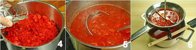 Stellen Sie den Topf auf den Herd, fügen Sie das Glas Wasser zum Fruchtfleisch der Kaktusfeigen hinzu 4. Bringen Sie es zum Kochen, bis die Würfel der Kaktusfeigen zerfallen sind 5, nehmen Sie dann den Topf vom Herd und passieren Sie das Fruchtfleisch durch ein Sieb, um die Samen zu entfernen 6.