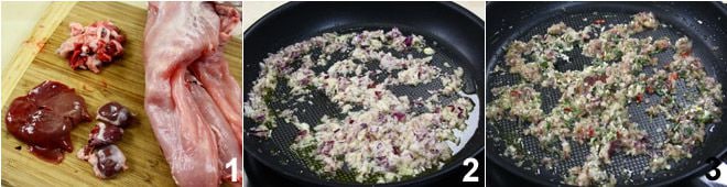 Um das Kaninchen im Schmortopf zuzubereiten, beginnen Sie damit, das überschüssige Fett vom Kaninchen zu entfernen, dann entnehmen Sie die Nieren, das Herz und die Leber, die Sie beiseitelegen 1. Waschen Sie das Kaninchen, tupfen Sie es mit Küchenpapier ab und schneiden Sie es in Stücke (oder kaufen Sie es bereits geschnitten). Schälen und hacken Sie die Zwiebel, geben Sie sie in eine Pfanne zusammen mit dem Öl 2 und lassen Sie sie bei schwacher Hitze mindestens 10 Minuten lang andünsten, ohne dass sie Farbe annimmt. Fügen Sie eine feine Mischung aus Peperoni, Rosmarin, Salbei, Lorbeer und Knoblauch hinzu 3, braten Sie für ein paar Minuten an,