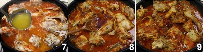 dann fügen Sie die Kaninchenstücke hinzu und lassen Sie sie goldbraun werden 4. Geben Sie den Weißwein dazu 5, den Sie verdampfen lassen, dann fügen Sie die Tomaten hinzu 6, salzen und pfeffern Sie und decken Sie mit einem Deckel ab.