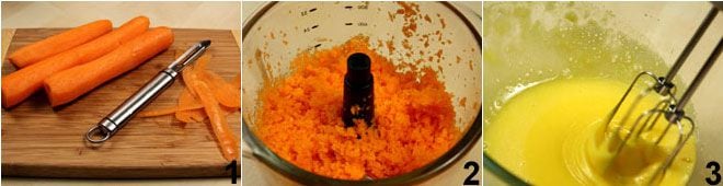 Um die Möhrenküchlein nach „Camille“-Art zuzubereiten, beginnen Sie damit, die Karotten gut zu waschen und zu schälen 1, dann hacken Sie sie fein in einem Mixer 2. In einer großen Schüssel schlagen Sie die Eier mit dem Zucker auf 3.