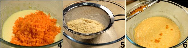 Wenn die Mischung hell und schaumig ist, fügen Sie die gehackten Karotten hinzu 4. Sieben und vermischen Sie Mehl, Mandelmehl, Kartoffelstärke, Backpulver 5 und fügen Sie sie der Eier-Zucker-Mischung hinzu. Zum Schluss fügen Sie die Schale einer Orange und die Samen einer Vanilleschote hinzu 6.