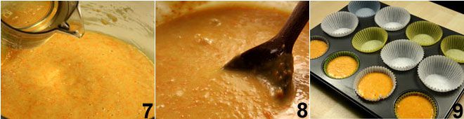 Fügen Sie dann das Pflanzenöl 7 zur Mischung hinzu und rühren Sie gut um; der Teig sollte sehr weich sein 8. Füllen Sie 12 Muffinformen (Durchmesser von etwa 6/7 cm) mit Papierförmchen (oder buttern und mehlen Sie sie) und geben Sie in jede Form den Möhrenteig 9, dabei einen Zentimeter vom Rand frei lassen. Backen Sie die Küchlein im vorgeheizten statischen Ofen bei 180 °C für etwa 20/25 Minuten, bis ein Stäbchen, das in die Mitte eines der Küchlein gesteckt und herausgezogen wird, trocken bleibt. Kühlen Sie die Küchlein ab, nehmen Sie sie aus den Formen und servieren Sie sie eventuell bestäubt mit Puderzucker.