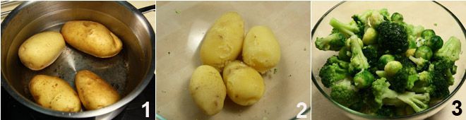 Waschen Sie die Kartoffeln und kochen Sie sie ungeschält ganz, indem Sie sie in einen Topf mit kaltem Wasser legen 1. Sobald das Wasser kocht, salzen Sie es und lassen Sie die Kartoffeln etwa 40 Minuten kochen, oder bis sie gar sind. Sobald sie etwas abgekühlt sind, schälen Sie die Kartoffeln und geben Sie sie in eine große Schüssel 2. Kochen Sie auch die Brokkoli, falls Sie frische Brokkoli verwenden, waschen Sie diese zuerst unter fließendem Wasser und putzen Sie sie, dann in Salzwasser kochen und noch bissfest abgießen 3.