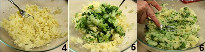 Dann zerdrücken Sie die Kartoffeln mit einer Gabel. Geben Sie die gut trockenen Brokkoli in die Schüssel 5 und zerdrücken Sie auch diese 6.