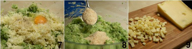 Sobald Sie eine ziemlich cremige Masse erhalten haben, fügen Sie Salz, weißen Pfeffer, ein Ei, 100 g geriebenen Emmentaler 7 und das Paniermehl 8 hinzu (falls die Masse zu klebrig ist, können Sie einen weiteren Esslöffel Paniermehl hinzufügen, andernfalls entfernen Sie einen). und den restlichen Emmentaler in kleine Würfel geschnitten 9