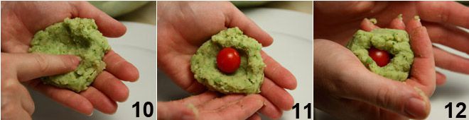 Vermischen Sie alles, indem Sie die Hände benutzen und lassen Sie die Masse 5 Minuten ruhen: Probieren Sie die Masse und würzen Sie sie eventuell nach. Nehmen Sie ca. 50-60 g der Masse 10, legen Sie eine Kirschtomate in die Mitte 11 und formen Sie eine runde Krokette darum (12-13).