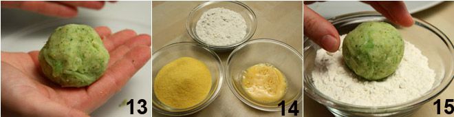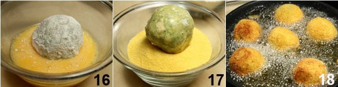 dann im verquirlten Ei 16 und schließlich im Maismehl 17. Geben Sie reichlich Erdnussöl in eine hochrandige Pfanne und erhitzen Sie es, dann, wenn es heiß ist, tauchen Sie die Kroketten hinein 18 und lassen Sie sie goldbraun werden, indem Sie sie mit zwei Gabeln wenden. Die goldbraun gewordenen Kroketten abtropfen lassen und auf einen mit Küchenpapier ausgelegten Teller legen. Servieren Sie die Kroketten, sobald sie lauwarm sind.