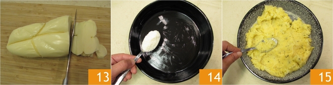 Wenn die Kartoffeln fertig sind, schält und zerdrückt sie noch heiß in einer großen Schüssel mit einem Kartoffelstampfer 7. Würzt sie mit Salz 8 und Pfeffer, dann fügt den geriebenen Grana hinzu 9.