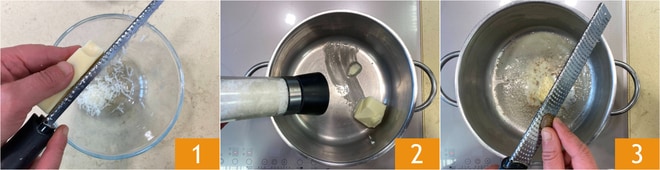 Um das Käse-Soufflé zuzubereiten, reiben Sie zuerst den Parmesan und den Gruyère 1. In einem Topf die Butter schmelzen, Salz und Pfeffer hinzufügen 2. Muskatnuss dazugeben 3.