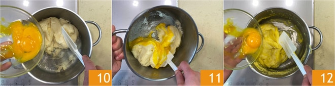 Zuerst zwei Eigelb hinzufügen 10, verrühren, um sie zu vermischen 11, und schließlich das letzte Eigelb hinzufügen 12. Erneut mischen und vollständig abkühlen lassen.