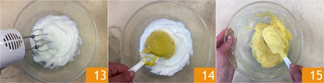 In der Zwischenzeit das Eiweiß schlagen, bis es halbsteif ist 13, einen Teil der Käsemischung hinzufügen und mischen 14, den Rest der Mischung hinzufügen und vorsichtig von unten nach oben mischen 15.
