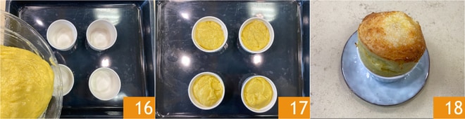 Alles in die Cocottes mit einem Durchmesser von 8 cm am Boden, 9 cm oben und 5 cm Höhe geben, vorher gebuttert 16 und mit geriebenem Parmesan bestreut 17. Im vorgeheizten statischen Ofen bei 160°C für 10 Minuten backen, dann ohne den Ofen zu öffnen die Temperatur auf 200°C Umluft erhöhen und weitere 10 Minuten backen. Herausnehmen und das Käse-Soufflé sofort servieren 18.