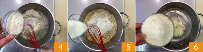 Fügen Sie das Mehl 4, die warme Milch 5 hinzu und bringen Sie es unter gelegentlichem Rühren zum Kochen. Sie sollten eine ziemlich dicke Mischung erhalten. Dann die Hitze ausschalten und die Käse hinzugeben 6.