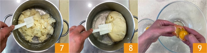 Gut vermischen 7, bis eine homogene Mischung entsteht 8. Abkühlen lassen. In der Zwischenzeit die Eier aufschlagen und das Eigelb vom Eiweiß trennen 9.