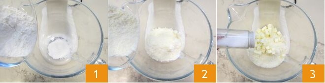 Um die Kekse mit Parmesan und Pecorino zuzubereiten, beginnen Sie damit, das Mehl in die Schüssel einer Küchenmaschine mit Flachrührer zu geben 1. Fügen Sie auch die beiden Käsesorten 2, die kalte, gewürfelte Butter, den Pfeffer und das Salz hinzu 3.