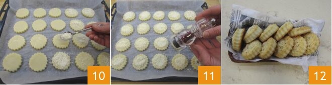 Legen Sie sie auf ein mit Backpapier ausgelegtes Backblech und streuen Sie etwas Parmesan in die Mitte jedes Kekses 10. Vervollständigen Sie das Ganze mit einer Prise frisch gemahlenem schwarzen Pfeffer 11 und backen Sie sie in einem vorgeheizten statischen Ofen bei 200° für 15 Minuten (wenn Sie im Umluftofen backen möchten, können Sie ein oder zwei Kekse backen, um Zeit und Temperatur für die nächsten zu testen). Nehmen Sie Ihre Kekse mit Parmesan und Pecorino aus dem Ofen, lassen Sie sie abkühlen und… genießen Sie sie 12!