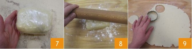 Wickeln Sie ihn in Frischhaltefolie ein und lassen Sie ihn 30 Minuten im Kühlschrank ruhen 7. Nach dieser Zeit holen Sie den Block heraus und rollen ihn mit einem Nudelholz 8 auf einer leicht bemehlten Arbeitsfläche auf eine Dicke von 3 mm aus. Verwenden Sie jetzt einen Ausstecher in der gewünschten Form, um Ihre Kekse zu formen 9; mit diesen Mengen und einer Ausstechform von 6 cm Durchmesser kamen etwa 14 Stück heraus!