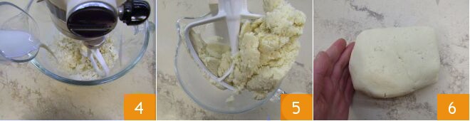 Betätigen Sie die Küchenmaschine bei mittlerer Geschwindigkeit, fügen Sie die kalte Milch in einem dünnen Strahl hinzu 4, und lassen Sie sie arbeiten, bis sich eine ziemlich kompakte Masse bildet 5 (wenn Sie keine Küchenmaschine haben, können Sie diesen Teig auch problemlos von Hand zubereiten). Übertragen Sie den Teig auf die Arbeitsfläche (möglichst kühl) und formen Sie ihn gerade genug, um ihm die Form eines abgeflachten Blocks zu geben 6.