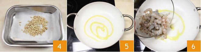 Rösten Sie nun die Pinienkerne: Legen Sie sie in eine mit Backpapier ausgelegte Form und backen Sie sie im vorgeheizten statischen Ofen bei etwa 10 Minuten bei 150° (oder im Umluftofen bei 130° für 5-6 Minuten) 4 und legen Sie sie beiseite, wenn Sie möchten, können Sie sie auch in der Pfanne rösten. Erhitzen Sie etwas Öl in einer Pfanne mit dem Knoblauch 5, fügen Sie die Riesengarnelen hinzu 6
