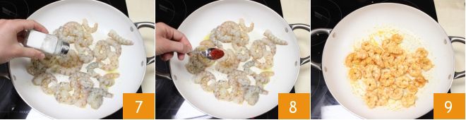 salzen 7, pfeffern und schließlich die Paprika hinzufügen. Braten Sie sie bei hoher Hitze für 5-6 Minuten (die Garzeit hängt von der Größe der Riesengarnelen ab, wenn sie sehr groß sind, brauchen sie ein paar Minuten mehr). Sobald sie gar sind, geben Sie sie in eine Schüssel, um sie abkühlen zu lassen.