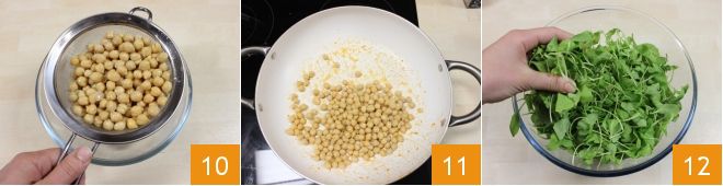 Nun die vorgekochten Kichererbsen abtropfen lassen 10. Wir haben vorgekochte Kichererbsen verwendet, aber Sie können auch getrocknete verwenden, achten Sie darauf, sie 12 Stunden einzuweichen; nach der erforderlichen Zeit die Kichererbsen abtropfen lassen, abspülen und in einem Topf mindestens 3 Stunden oder im Schnellkochtopf eine bis eineinhalb Stunden kochen, am besten bei niedriger Hitze; sobald sie gekocht sind, können sie zur Zubereitung hinzugefügt werden. In derselben Pfanne, die für die Riesengarnelen verwendet wurde, erhitzen Sie die Kichererbsen 11, damit sie den Geschmack der Krustentiere annehmen). Jetzt, da alle Zutaten bereit sind, können Sie den Salat zusammenstellen: Geben Sie den gewaschenen und getrockneten Rucola in eine große Schüssel 12.