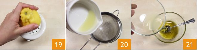 Den Saft einer halben Zitrone auspressen 19, filtern 29 und zur Emulsion hinzufügen 21,