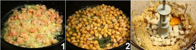In einen Topf geben Sie das Öl, die Butter, den gehackten Knoblauch und die Schalotte; lassen Sie alles bei niedriger Hitze für 10-15 Minuten weich werden, dann fügen Sie die Garnelen hinzu 1 und lassen Sie sie für 5 Minuten kochen, dann fügen Sie die Kichererbsen, die Thymianblätter, das Salz und den Pfeffer hinzu 2. Wenn alles gut gewürzt ist und die Kochflüssigkeit eingekocht ist, schalten Sie das Feuer aus und lassen es abkühlen. Geben Sie alle Zutaten in einen Mixer und pürieren Sie sie, fügen Sie dann das Ei und die gewürfelten Weißbrotscheiben hinzu 3.