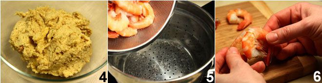 Mixen Sie weiter, bis Sie eine glatte und homogene Masse erhalten 4. In der Zwischenzeit kochen Sie die Garnelen 5 und schälen Sie sie, dabei nur den Schwanzteil belassen 6.