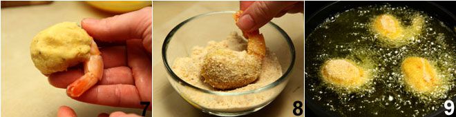 Teilen Sie die Mischung in 15 Kugeln, die Sie, indem Sie sie flachdrücken, um die Garnelen wickeln 7, um Kroketten zu formen, bei denen der Garnelenschwanz sichtbar bleibt. Tauchen Sie die Kroketten in das verquirlte Ei und dann in die Semmelbrösel 8, frittieren Sie sie dann im heißen Öl 9 (maximal 180-200°C) und lassen Sie sie auf einem mit Küchenpapier ausgelegten Teller abtropfen. Wenn Sie möchten, können Sie die Kichererbsen-Garnelen-Kroketten auch im Ofen zubereiten, indem Sie die Ofentemperatur auf 200 Grad einstellen und die Kroketten etwa 15 Minuten oder bis sie goldbraun sind, backen. Servieren Sie die Kichererbsen-Garnelen-Kroketten noch heiß, begleitet, wenn Sie mögen, von einigen Saucen wie Mayonnaise, Sojasauce, Cocktailsauce.