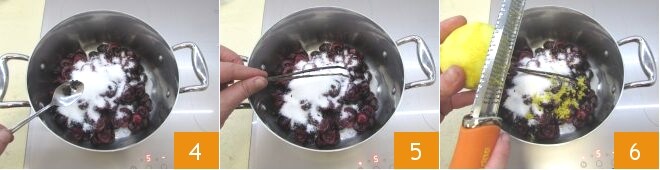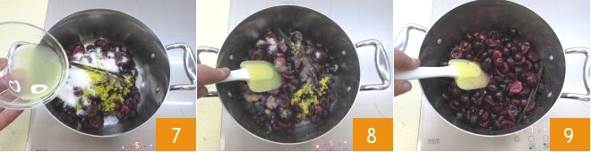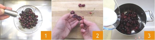Um das Kirsch-Vanille-Kompott zuzubereiten, waschen Sie zuerst die Kirschen gründlich mit kaltem Wasser 1. Lassen Sie sie abtropfen und entfernen Sie die Kerne und Stiele 2, und sammeln Sie sie in einem Topf mit dickem Boden, indem Sie auch den Zucker hinzufügen 3.