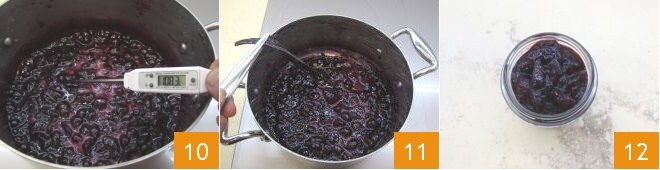 Kochen Sie so weiter für etwa 40 Minuten, oder bis das Kompott die Temperatur von 108° erreicht hat 10: dann ist es fertig. Entfernen Sie die Vanilleschote 11 und füllen Sie das Kirsch-Vanille-Kompott in einen Behälter um 12.