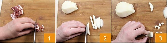 Um die klassischen Blätterteigtaschen mit Birnen und Speck zuzubereiten, beginnen Sie damit, den Speck in sehr kleine Würfel zu schneiden 1. Dann schälen Sie die Birnen, entfernen das Kerngehäuse, schneiden sie in Hälften und dann in dünne Scheiben, die Sie weiter in kleine Würfel schneiden (2-3). Es ist besser, Speck und Birnen in gleicher Größe zu schneiden, damit sie gleichmäßig garen.