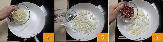 Geben Sie die Birnen in die Pfanne 4, fügen Sie das Wasser hinzu 5 und lassen Sie sie bei starker Hitze etwa 10 Minuten kochen. An diesem Punkt fügen Sie den Speck hinzu 6 und fahren mit dem Kochen fort.