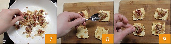 Wenn die Birnen eine goldene Farbe angenommen haben, was etwa 20 Minuten dauert, fügen Sie nach Belieben ein paar Rosmarinnadeln hinzu 7 und schalten Sie das Feuer aus. Geben Sie einen Löffel der Birnen- und Speckwürfel auf jede der 12 Blätterteigstückchen 8 und beenden Sie es, indem Sie ein paar Rosmarinnadeln 9 auf jede klassische Blätterteigtasche mit Birnen und Speck legen.