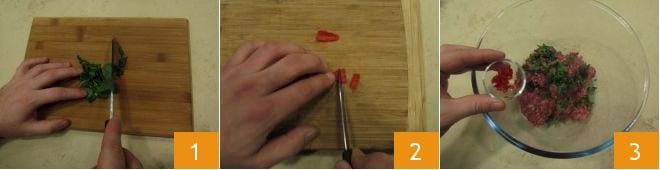 Um die Kofta (nahöstliche Fleischbällchen) vorzubereiten, hacken Sie die Minzblätter fein 1, dann halbieren Sie die Chilischote der Länge nach, entfernen Sie die Samen mit der Messerspitze und zerkleinern Sie sie 2. Geben Sie das Lammfleisch in eine Schüssel zusammen mit der gehackten Minze und dem Chili 3.