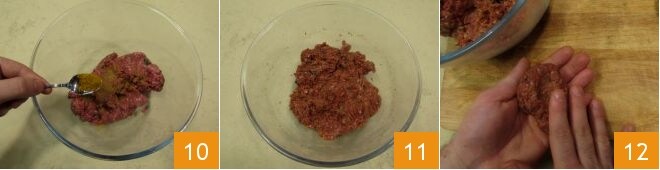 fügen Sie dann das Ras el Hanout hinzu 10 und mischen Sie alles erneut 11. Formen Sie aus der vorbereiteten Masse längliche Bällchen von etwa 80 g 12,