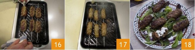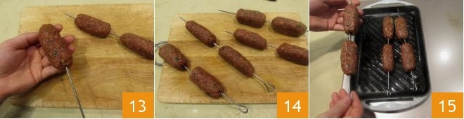 dann stecken Sie sie auf die Spieße 13: Mit unseren Mengen sollten Sie 8 Stück erhalten. Wenn Sie fertig sind 14, erhitzen Sie den Grill und braten Sie das Fleisch 2 Minuten pro Seite 15,