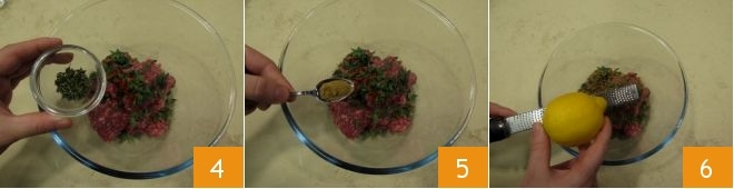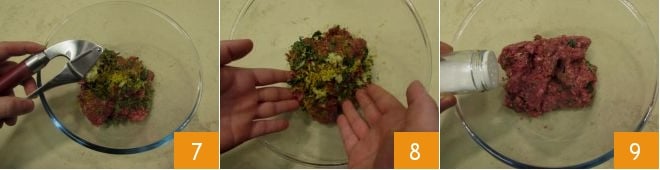 zerdrücken Sie den Knoblauch 7 und mischen Sie energisch mit den Händen, um alle Zutaten gut zu vermengen 8. Würzen Sie mit Salz und Pfeffer 9,