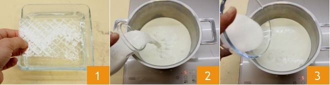 Um die Kokos-Panna-Cotta mit Himbeercoulis zuzubereiten, beginnen Sie damit, das Gelatineblatt in einem Behälter mit kaltem Wasser einzuweichen. Lassen Sie es mindestens 10 Minuten vollständig weich werden 1 und beginnen Sie in der Zwischenzeit, die Panna Cotta vorzubereiten. Erhitzen Sie in einem kleinen Topf die Sahne bei niedriger Hitze, ohne sie zum Kochen zu bringen; dann fügen Sie die Kokosmilch 2 und den Zucker 3 hinzu und mischen Sie gut mit dem Schneebesen.