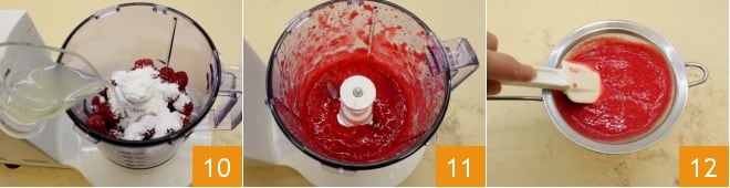 Fügen Sie den Zitronensaft hinzu 10 und pürieren Sie alles 11. Filtern Sie das Coulis, das Sie erhalten haben, mit einem feinen Sieb und helfen Sie sich mit einem Spatel 12 und legen Sie es dann beiseite.