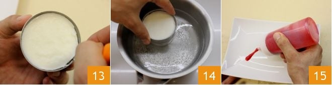 Nach 3 Stunden, wenn die Panna Cotta fest ist, stecken Sie die Klinge eines kleinen Messers zur Hälfte in die Form und gehen Sie den gesamten Umfang entlang, um die Panna Cotta von den Rändern zu lösen 13. Tauchen Sie dann jede Form für ein paar Sekunden in kochendes Wasser, bis 2-3 mm vom Rand entfernt 14. Nachdem Sie diesen Schritt abgeschlossen haben, dekorieren Sie den Servierteller mit dem Himbeercoulis, um die Basis zu schaffen, auf der Sie dann die Panna Cotta platzieren, verwenden Sie dazu einen Spender 15 oder einen Spritzbeutel.