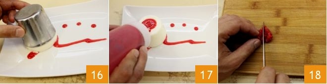 Zuletzt stürzen Sie die Panna Cotta (falls nötig, geben Sie ein paar kleine Schläge, um sie herauszubekommen) 16 und garnieren Sie sie dann mit dem Coulis auf der Oberseite 17. Schließlich schneiden Sie mit einem Messer die übrig gebliebenen Himbeeren in der Mitte auf 18;