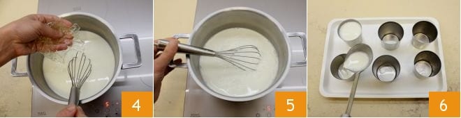 Nach 10 Minuten drücken Sie das Gelatineblatt mit den Händen gut aus 4 und fügen Sie es der Mischung hinzu, rühren Sie gut um, bis es vollständig aufgelöst ist 5 (falls Klumpen vorhanden sind, geben Sie alles durch ein feines Sieb). Schalten Sie an diesem Punkt die Hitze aus und bereiten Sie auf einem Tablett 6 Förmchen mit einem Fassungsvermögen von 150 ml vor, indem Sie das Innere mit Wasser benetzen: dieser Vorgang hilft Ihnen, die Panna Cotta später besser zu entnehmen. Dann gießen Sie mit einer Kelle die Kokos-Panna-Cotta in die Förmchen und füllen sie bis zum Rand 6.