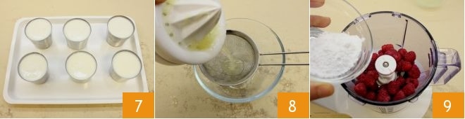 Nachdem Sie diesen Vorgang abgeschlossen haben 7, stellen Sie die Kokos-Panna-Cotta für mindestens 3 Stunden in den Kühlschrank zum Festwerden und bereiten Sie in der Zwischenzeit das Himbeercoulis vor, also die Begleitsauce; pressen Sie eine Zitrone aus und filtern Sie den Saft mit einem Sieb 8, dann geben Sie die Himbeeren (6 für die endgültige Dekoration beiseite halten) und den gesiebten Puderzucker in einen Mixer 9.