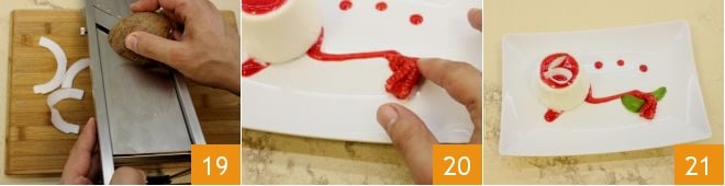 schneiden Sie mit der Mandoline dünn den Kokos 19 und vervollständigen Sie die Dekoration mit einer Himbeere 20, ein paar Minzblättern und den Kokosscheiben 21; sobald Sie fertig sind, servieren Sie die Kokos-Panna-Cotta mit Himbeercoulis sofort.