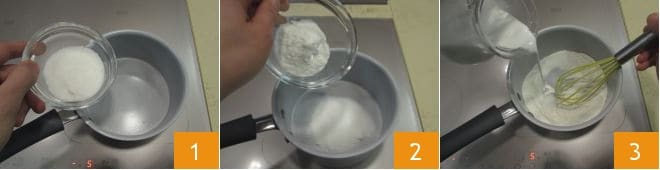 Um die Kokosmilchcreme zuzubereiten, beginnen Sie damit, den Zucker 1 und das Reismehl 2 in einen Topf zu geben. Fügen Sie dann nach und nach die Kokosmilch hinzu und rühren Sie dabei ständig mit einem Schneebesen 3.