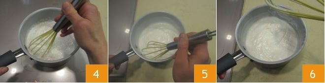 Stellen Sie den Topf auf den Herd und rühren Sie weiter 4, bis die gewünschte Dichte erreicht ist, dann vom Herd nehmen und weiter rühren (5-6).